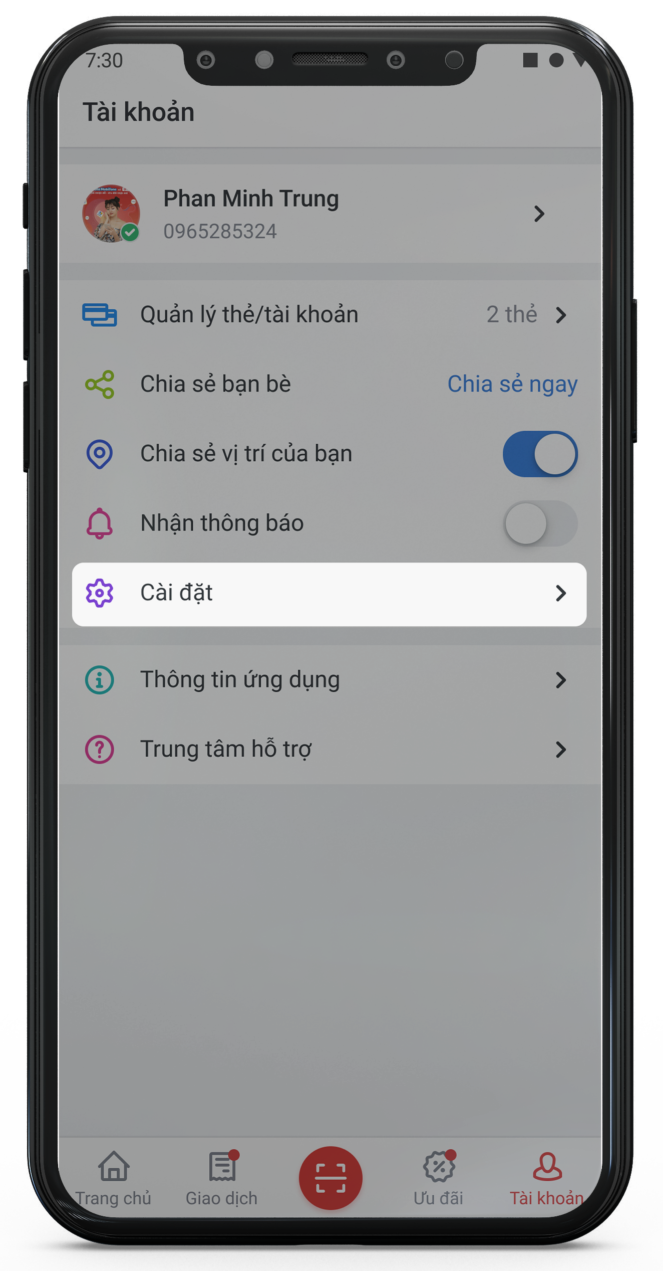 Bước 1: Tại màn hình chính chọn "Tài khoản" => "Cài đặt"