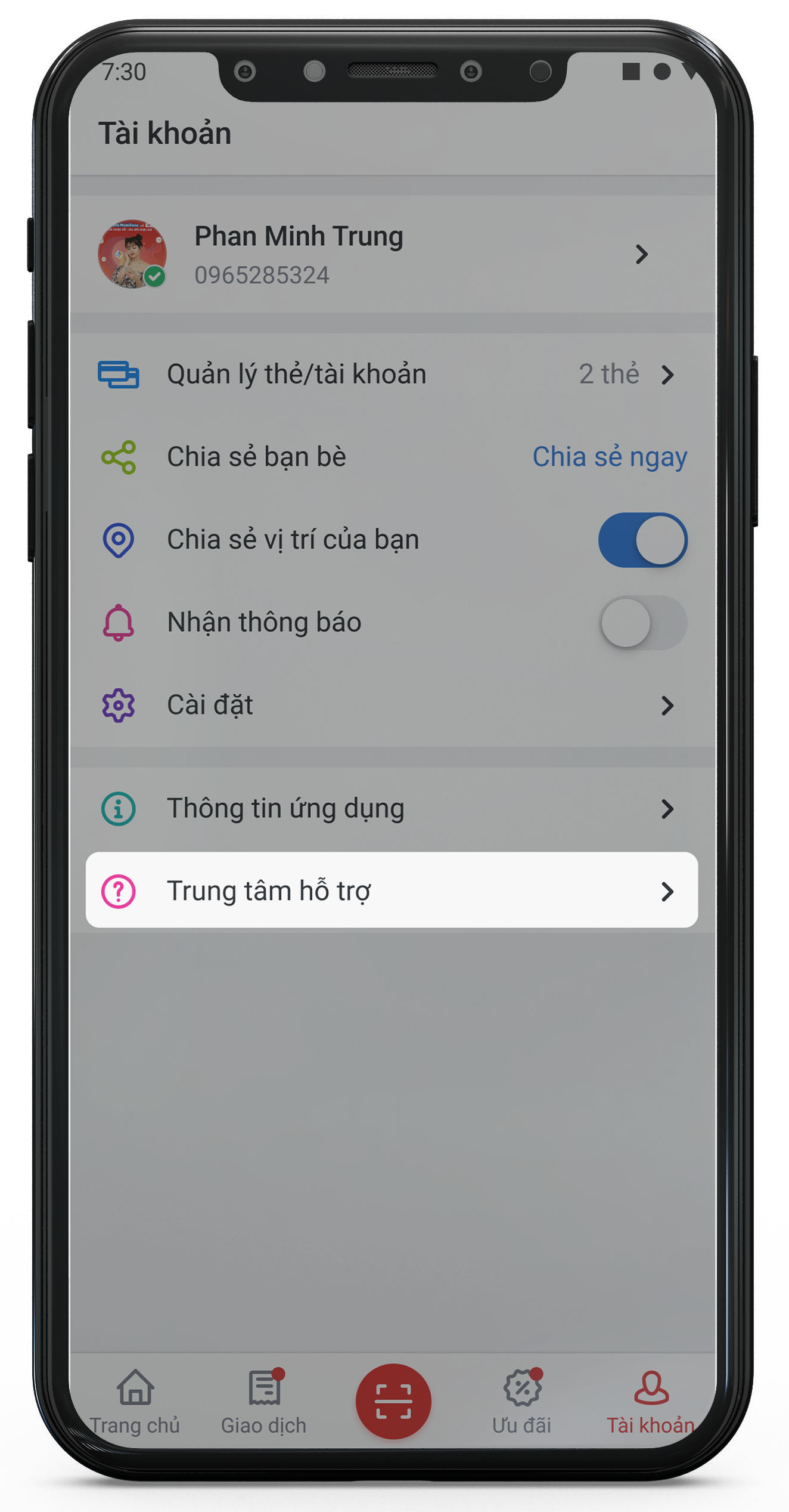 Bước 1: Tại màn hình chính, chọn "Tài khoản" => mục "Trung tâm hỗ trợ"