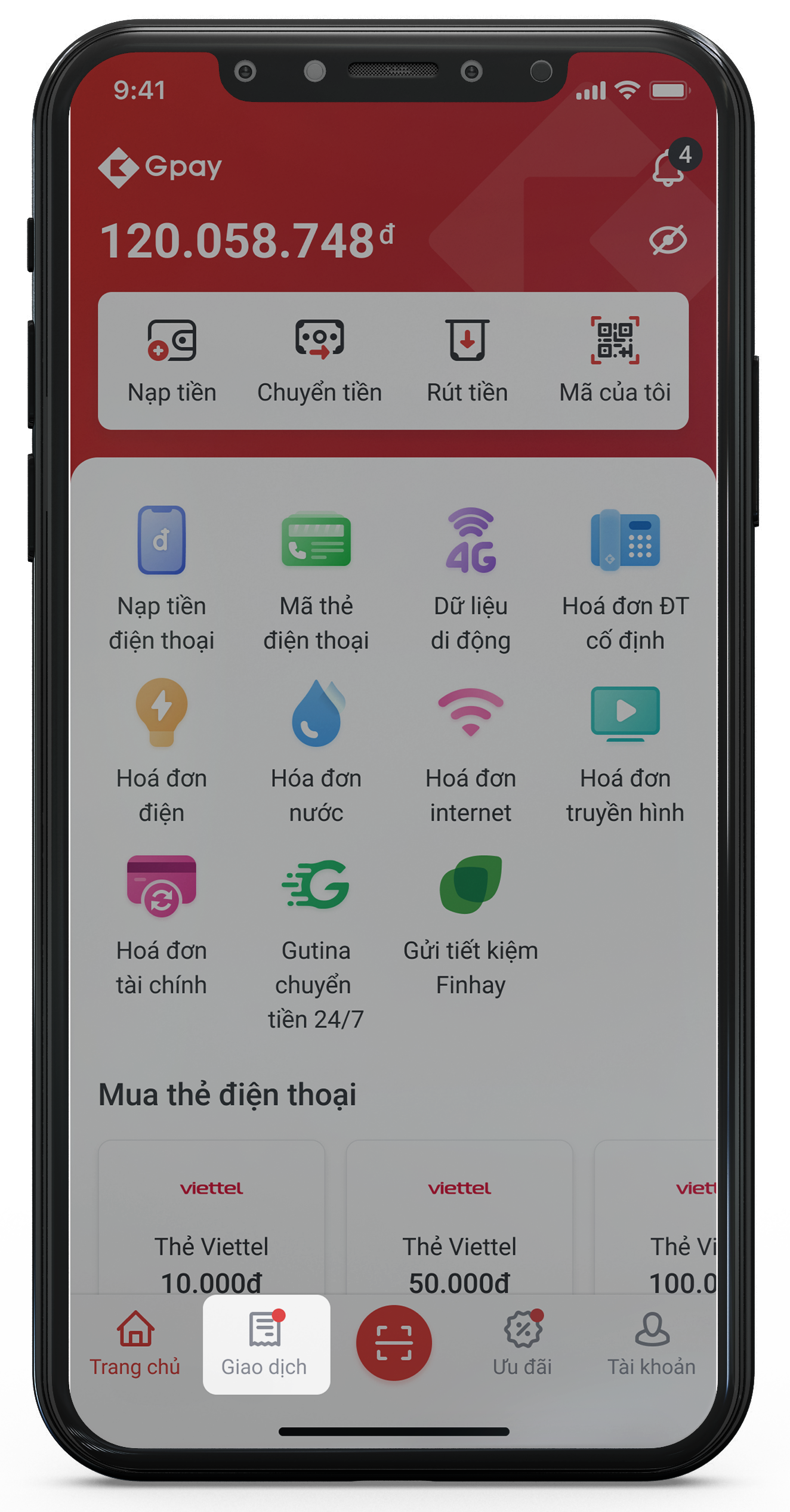 Bước 1: Từ màn hình chính, chọn "Giao dịch"